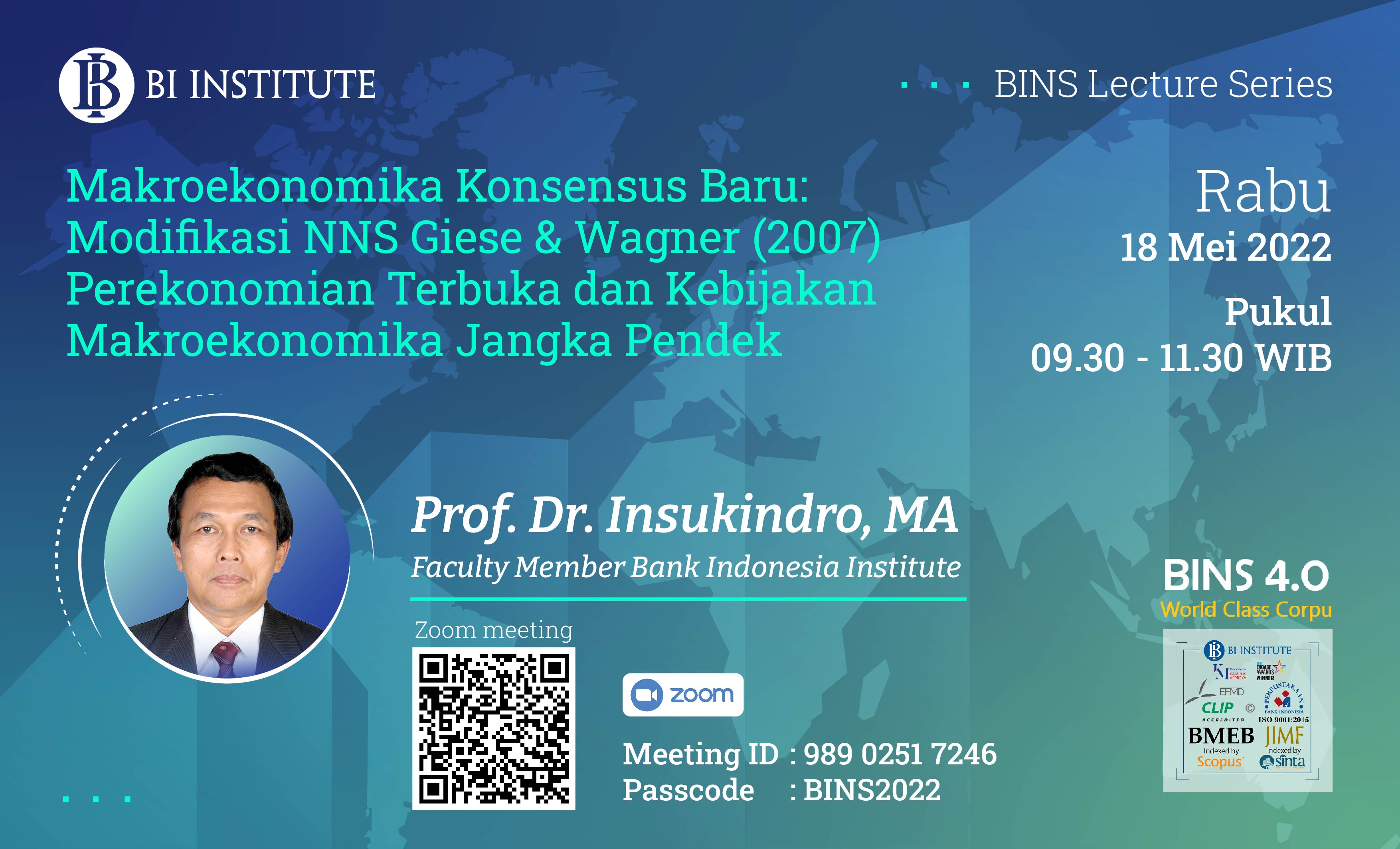 Lecture Series merupakan salah satu bentuk program capacity building dari BI Institute dengan format pengajaran yang bersifat akademis/ilmiah. Lecture Series bersama Prof. Insukindro Ke-24 masih terkait dengan dua kegiatan sebelumnya. Pada kesempatan ini, kuliah virtual mengusung tema “Makroekonomika Konsensus Baru: Modifikasi NNS Giese & Wagner (Perekonomian Terbuka & Kebijakan Makroekonomi Jangka Pendek)”. Pokok bahasan diskusi mencakup Tinjauan Konsep Modifikasi Giese & Wagner Perekonomian Terbuka (MGW-PT); Kebijakan Makroekonomika; serta Analisis MGW-PT Kebijakan Makroekonomika Jangka Pendek.